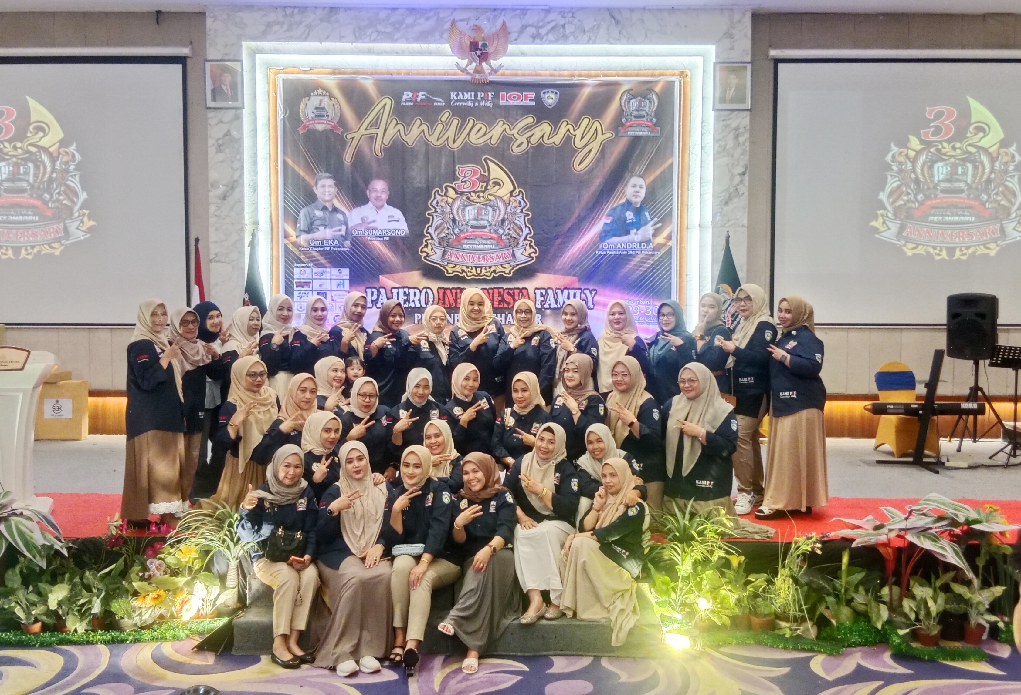 Pekanbaru, www.radaroke.com - Pajero Indonesia Family (PIF) Pekanbaru Chapter, gelar anniversary ke-3 pada Sabtu (29/11/2025) di Hotel Asnof Jalan Tuanku Tambusai Pekanbaru. Terlihat Om Om dan Tante Tante ramai memadati ruangan acara.